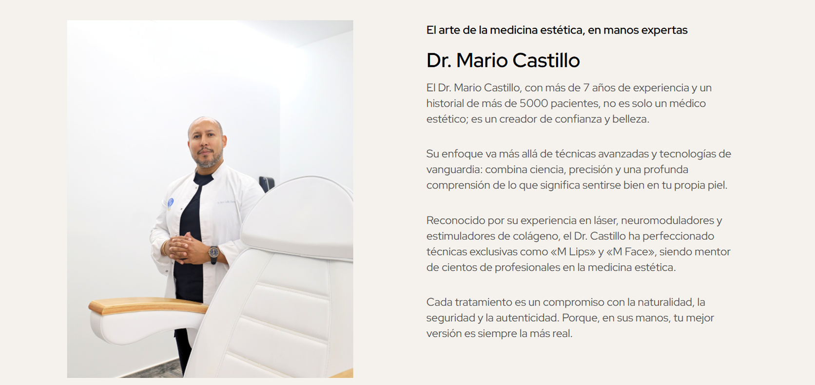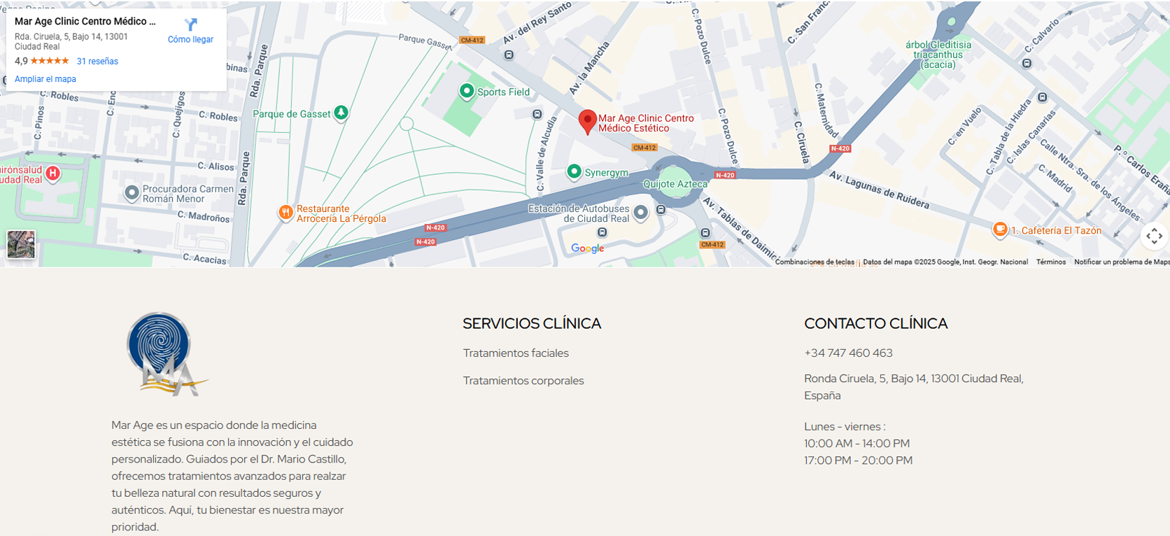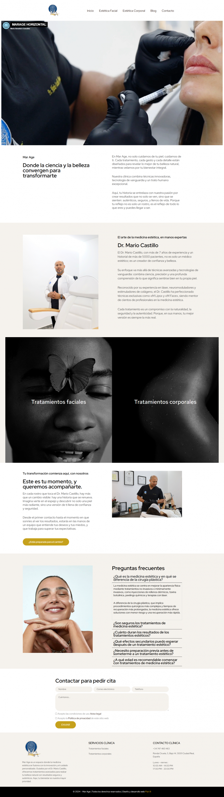 Diseñamos la presencia digital de Mar Age como un espacio completo y riguroso, donde la medicina estética se explica con claridad y confianza. La home se abre con un vídeo corporativo y bloques que presentan la filosofía de la clínica, la trayectoria del Dr. Mario Castillo, la selección de tratamientos estrella, un CTA directo y formularios accesibles para pedir cita. A partir de ahí, la web se despliega en un ecosistema de contenidos especializado: más de 16 páginas de Estética Facial y 7 páginas de Estética Corporal con descripciones detalladas y visuales cuidadas, un blog con artículos divulgativos y un apartado de contacto con mapa y datos clave. Todo con una estructura intuitiva, diseño responsive adaptado a móvil, tablet y escritorio, y una experiencia alineada con lo que busca el paciente: información fiable, cercanía y un camino sencillo hasta la consulta.